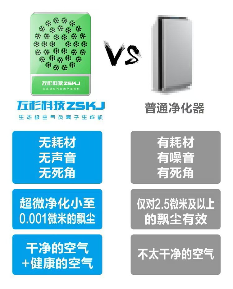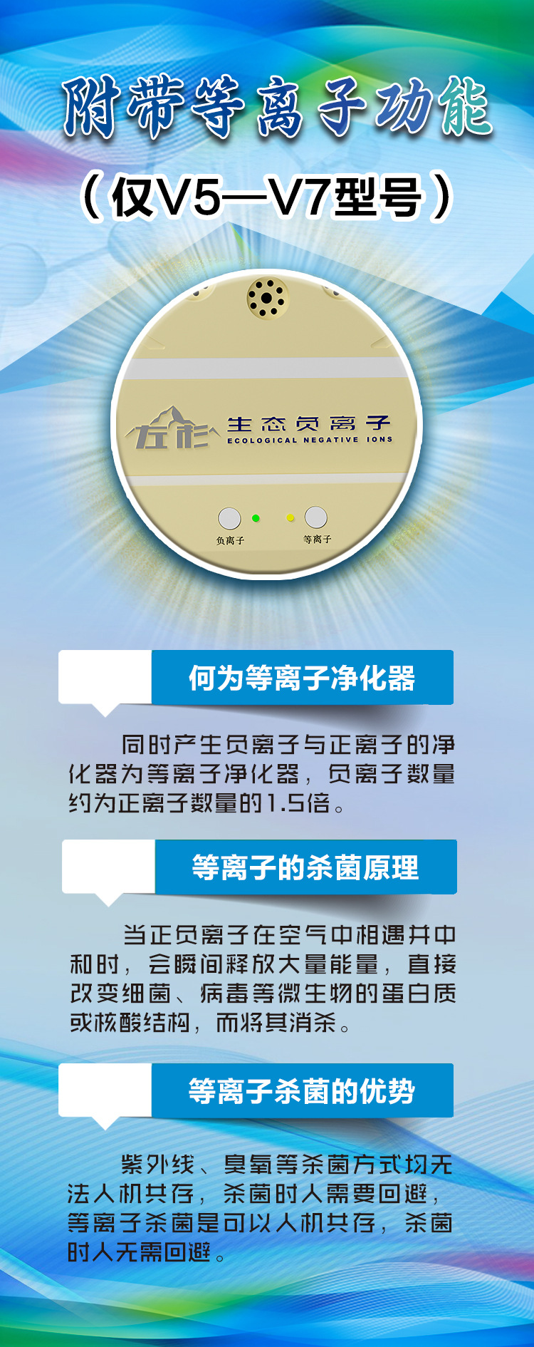 ZS-V8:负离子浓度5亿个/cm³;ZS-V9:负离子浓度6亿个/cm³